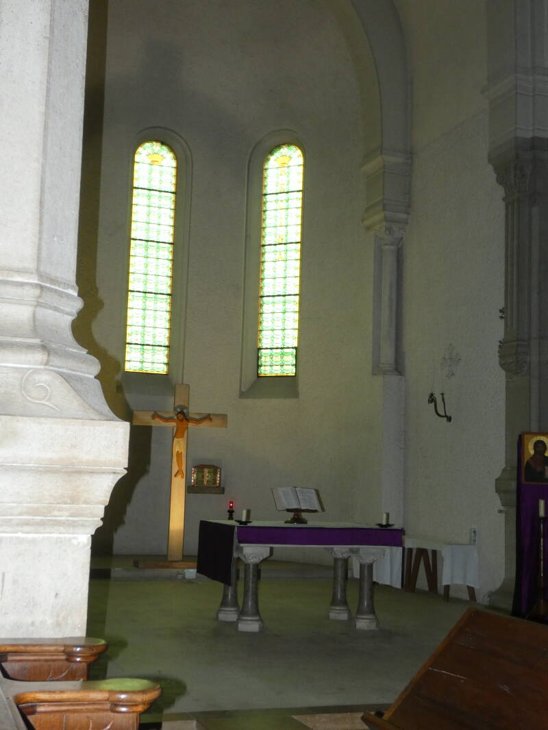 Les vitraux du chœur représentent les vagues des étangs de la Dombes.