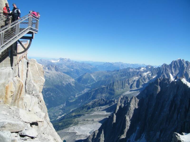 À l'arrivée, une passerelle permet de gagner le piton central que l'on peut explorer via des galeries percées dans la roche. De là, un ascenseur de 66 mètres conduit à 3 842 mètres au sommet de l'aiguille sur la terrasse panoramique surmontée de l'émetteur hertzien. La vue s'y développe à 360°, offrant un panorama sur le massif du Mont-Blanc, la vallée de l'Arve tout en contrebas, ainsi que les principaux sommets des Alpes, français et étrangers. Depuis l'aiguille du Midi, il est possible de poursuivre l'excursion via la télécabine Panoramic Mont-Blanc. Ce téléphérique pulsé survole la vallée Blanche et le Glacier du géant jusqu'à la pointe Helbronner, marquant la frontière entre la France et l'Italie à 3 466 mètres d'altitude. L'aiguille du Midi est très fréquentée par les alpinistes comme point de départ pour de nombreux sommets entourant la vallée Blanche, et pour ses nombreuses voies glaciaires, mixtes ou purement rocheuses. C'est également le point de départ de la descente en ski de la vallée Blanche.