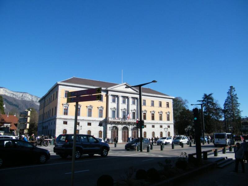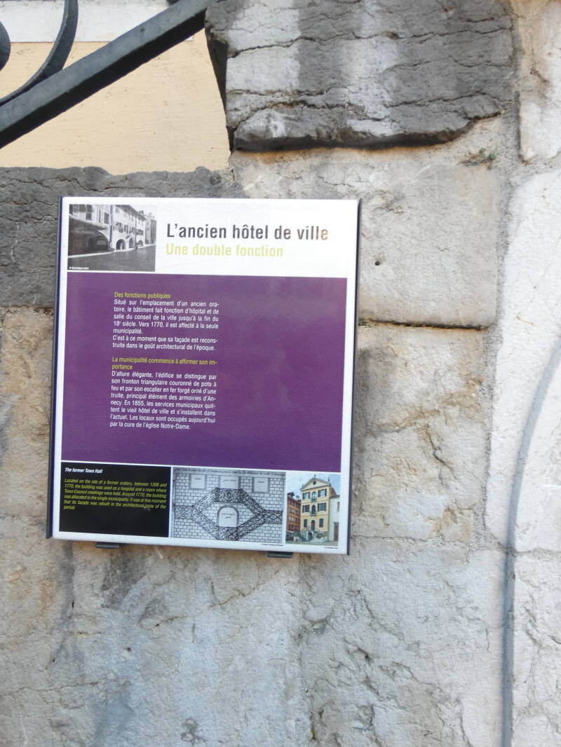 Le bâtiment élégant se situe à la gauche de l’église Notre-Dame dans la Vieille Ville d’Annecy. Il a pris la place d’un ancien oratoire médiéval. La façade est construite en 1770. L’édifice est d’abord un établissement hospitalier ainsi qu’une salle de conseil municipal. Après 1770, il sert uniquement de mairie et accueille les réunions de la municipalité.