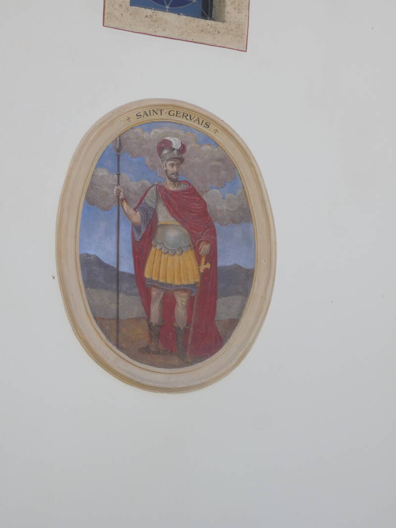 La façade orientée à l'Est vers le village est coupée en panneaux par quatre pilastres. Le portail à ouverture plein cintre est surmonté d'un fronton et d'une niche abritant la statue de la Vierge. De chaque côté du portail un médaillon peint représentant Saint Gervais tenant une lance et Saint Protais dégainant son épée. La serlienne (fenêtre triple) ouvre sur le buffet d'orgue qui se trouve derrière.