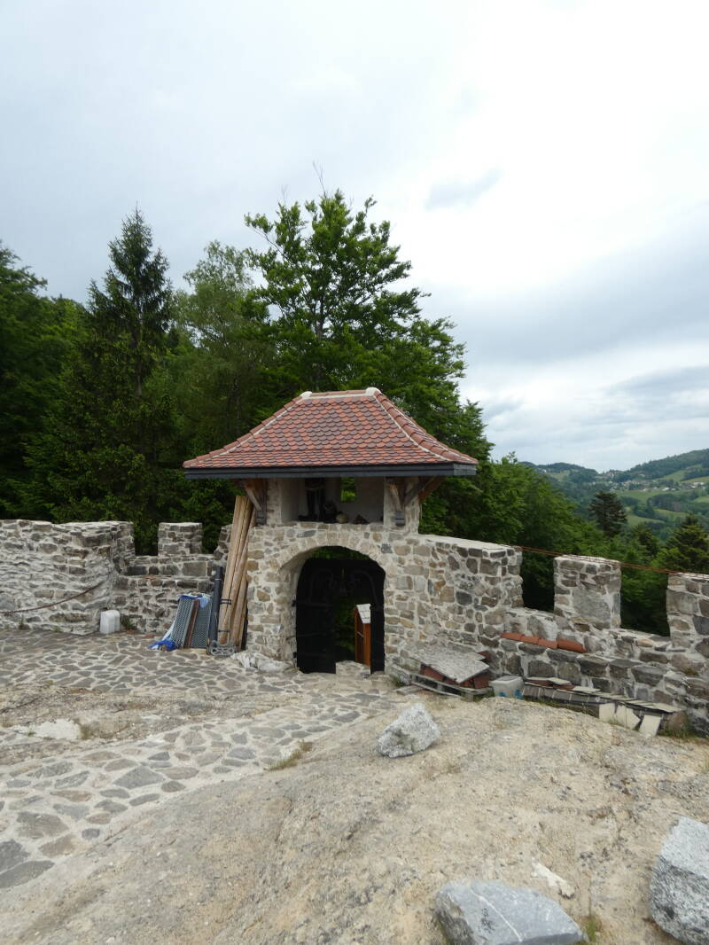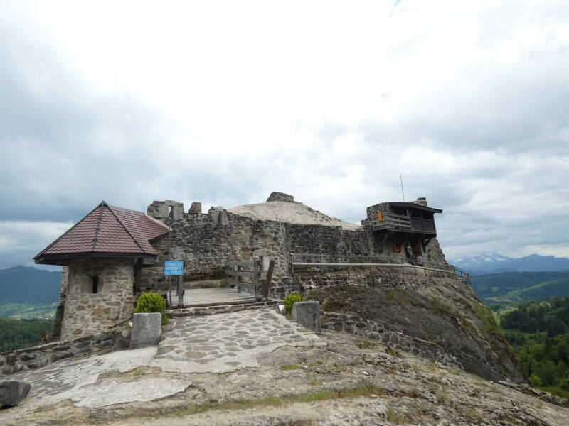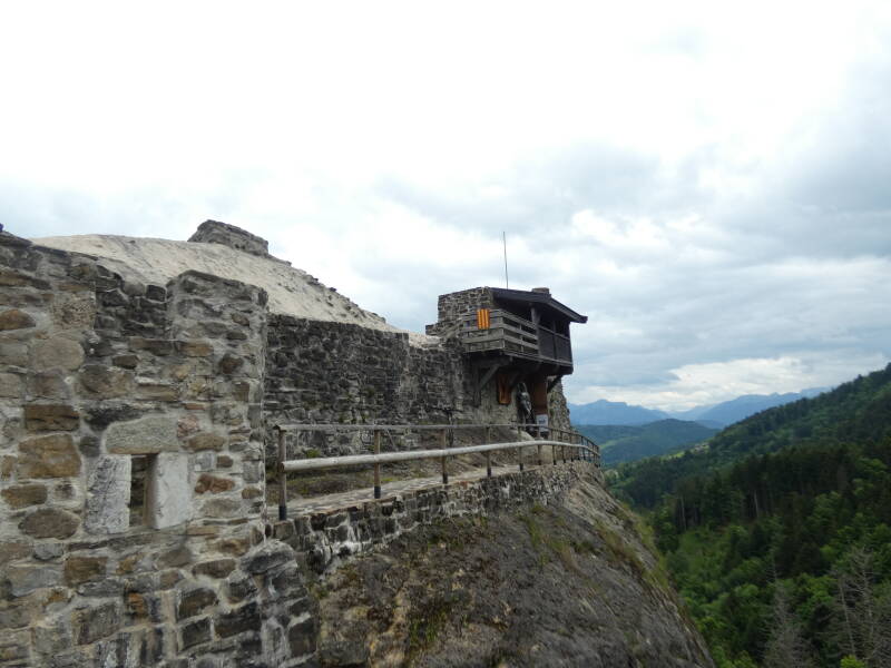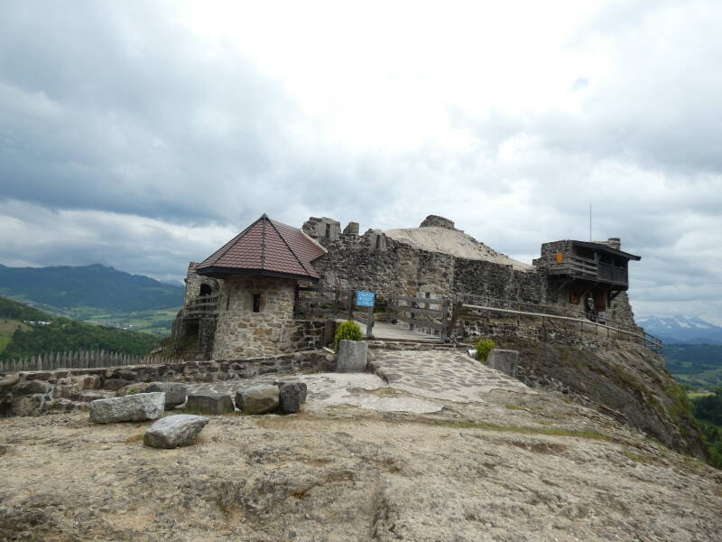 Le château évoque le type de construction du premier âge roman. La tour circulaire et les bâtiments situés plus à l'est appartiennent à un aménagement postérieur.