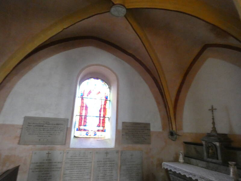 A gauche en entrant dans l’édifice, au milieu de la nef, la chapelle funéraire des Comtes de Brotty d’Antioche, édifiée au 15e sc. a été conservée.