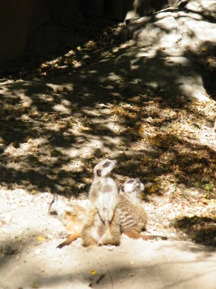 Pour rechercher sa nourriture, le suricate doit creuser très profondément dans le sol. C'est pourquoi des sentinelles se relaient toute la journée pour donner l'alerte. Un grondement agressif avertit d'un danger encore imprécis, un aboiement signale l'arrivée d'un prédateur terrestre et un cri d'alarme particulier annonce les rapaces.