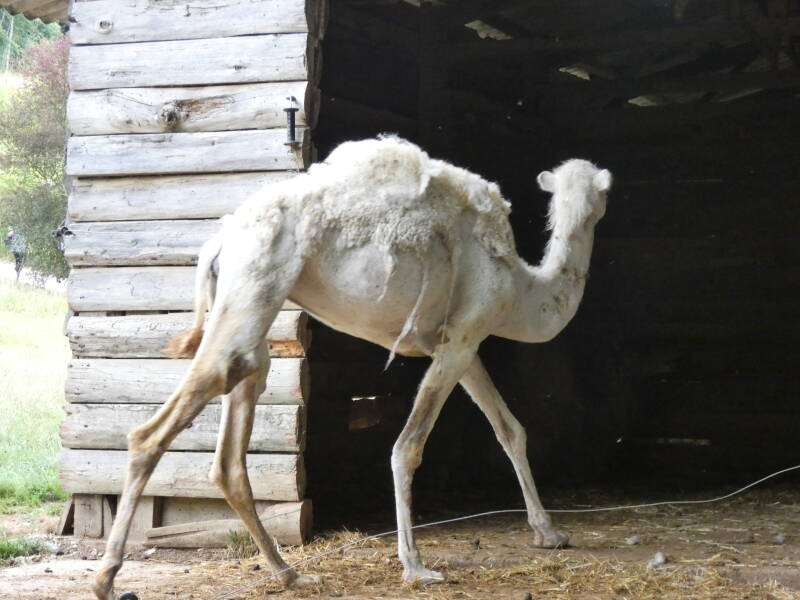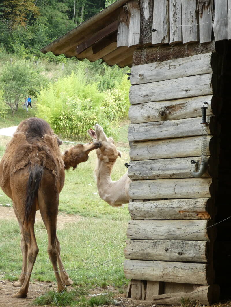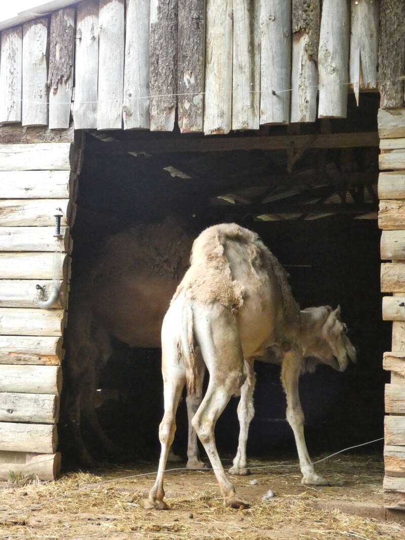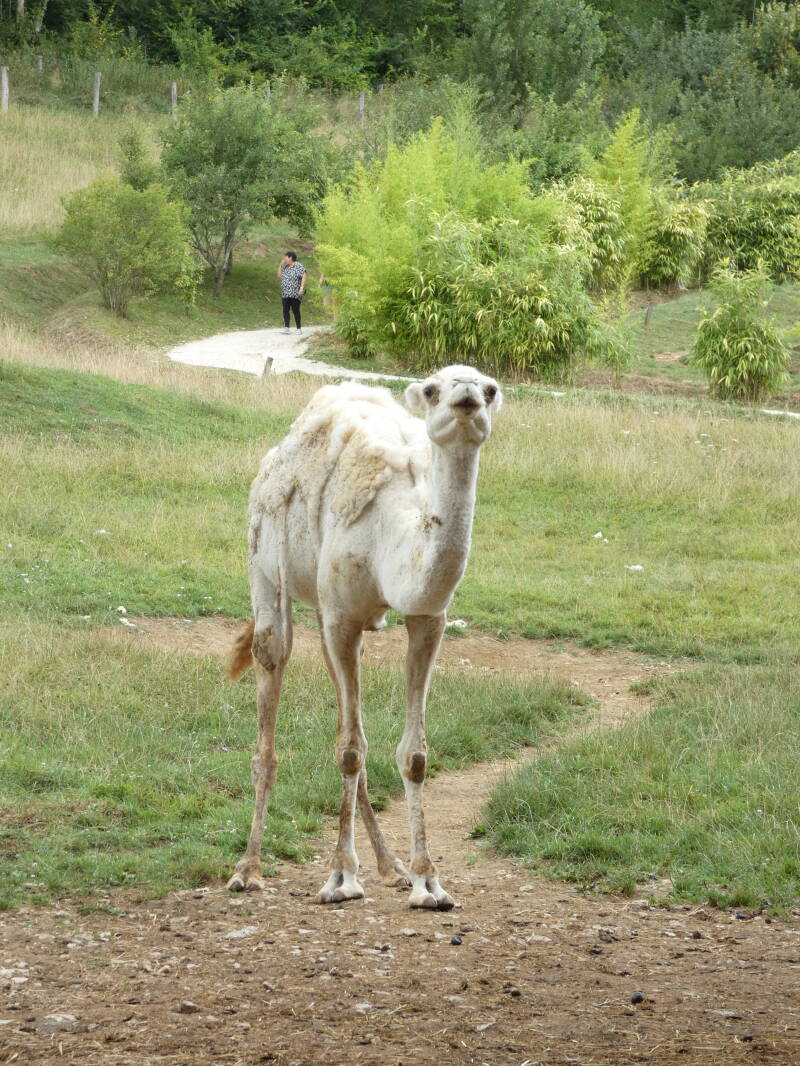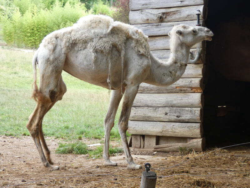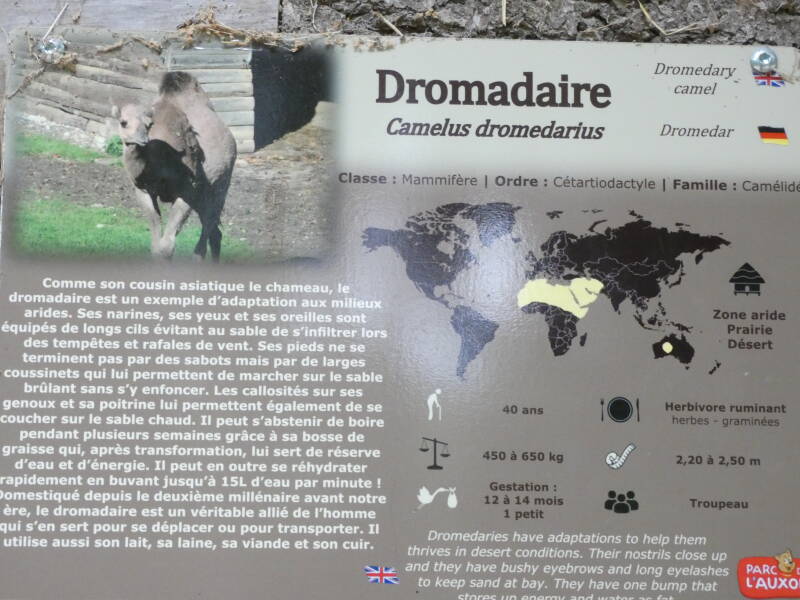 Le dromadaire, cousin du Chameau qui s’en différencie par la présence d’une unique bosse, est domestiqué depuis plusieurs millénaires avant Jésus-Christ. On l’utilise en tant que bête de somme et de monte ainsi que pour sa production de lait. Il vit en harem: un mâle dominant mène un groupe de femelles avec leur progéniture. Il se nourrit de plantes épineuses sans en ressentir de séquelles grâce à ses lèvres particulièrement épaisses.