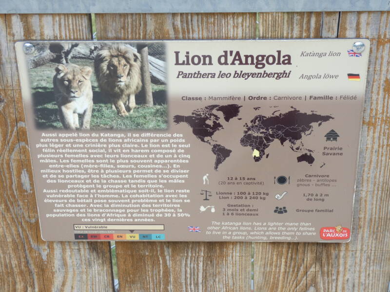 Le lion (Panthera leo) est représenté par différentes sous-espèces ,l’une indienne et toutes les autres africaines. Le lion d’Angola ou lion du Katanga se distingue par une crinière relativement claire.
