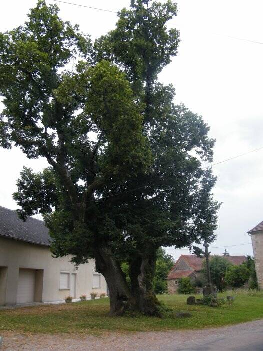 Un cas de grand intérêt patrimonial. Ce tilleul aurait été planté sous le règne d'Henry IV à l'emplacement d'un cimetière gaulois. Il serait donc vieux de plus de 4 siècles! Il est probable que la partie la plus ancienne est la souche, les parties aériennes étant de vieux rejets creux. Le feuillage est vigoureux, véritable défi lancé au temps! Les foires d'Auxy se tenaient à son pied au XIXème siècle. Ce tilleul est classé Monument Historique depuis 1932! Il est aujourd'hui affaibli et tomberait certainement sans armatures.