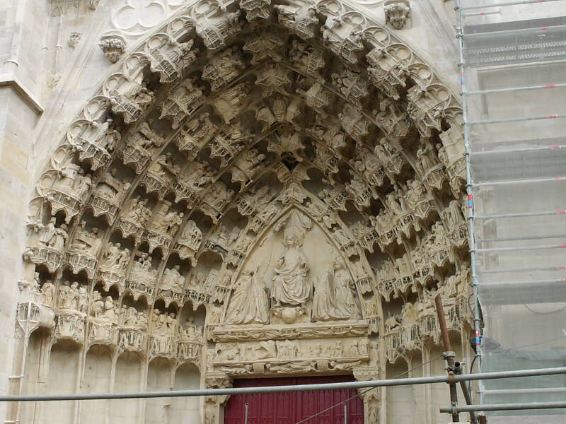 La façade occidentale possède un important décor floral de crochets, disposés en bandes verticales, en semis ou en tapis. Au rez-de-chaussée ou premier niveau de la façade se trouvent trois portails séparés par les imposants contreforts.