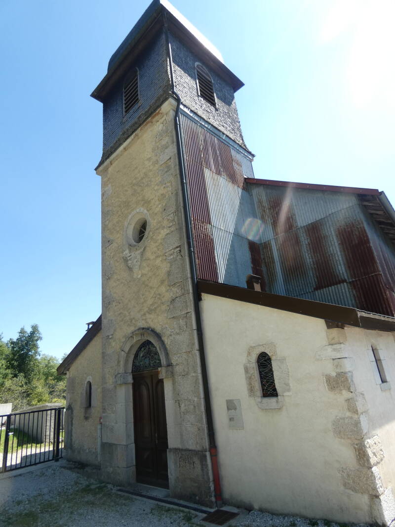 Eglise à tour clocher hors-oeuvre en façade, avec vestibule voûté d'arêtes. Le vaisseau unique a 2 travées couvertes d'une fausse voûte d'arêtes. Deux chapelles à fausses voûtes d'arêtes forment un transept bas. Le choeur est couvert d'une fausse voûte d'arêtes à six quartiers sur culots. Les faces sud et ouest de la nef sont protégées par un essentage de tôle ondulée, la partie supérieure du clocher par un essentage de petits bardeaux, ou tavaillons. Le toit à l'impériale du clocher est couvert de matériau synthétique ; les toits de la nef et du transept bas sont à longs pans avec pignons couverts ; celui du choeur a une croupe à 3 pans sur l'abside.