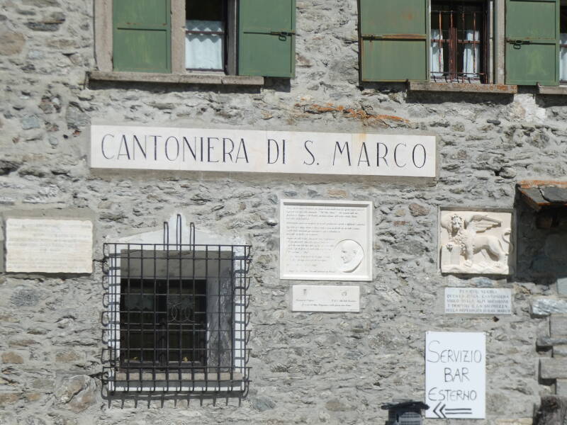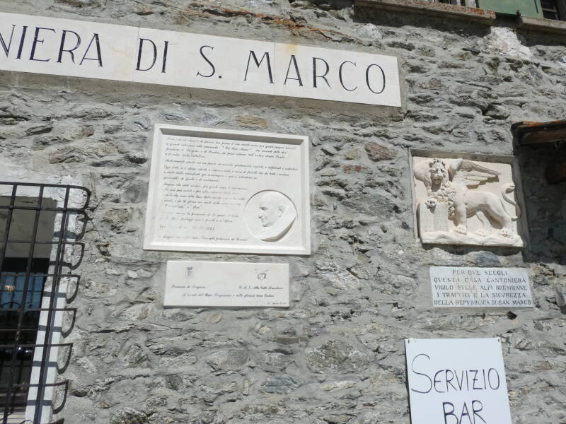 Sur la façade une inscription rappelle : « Per due secoli questa cantoniera vigilò sulle alpi Brembane… »