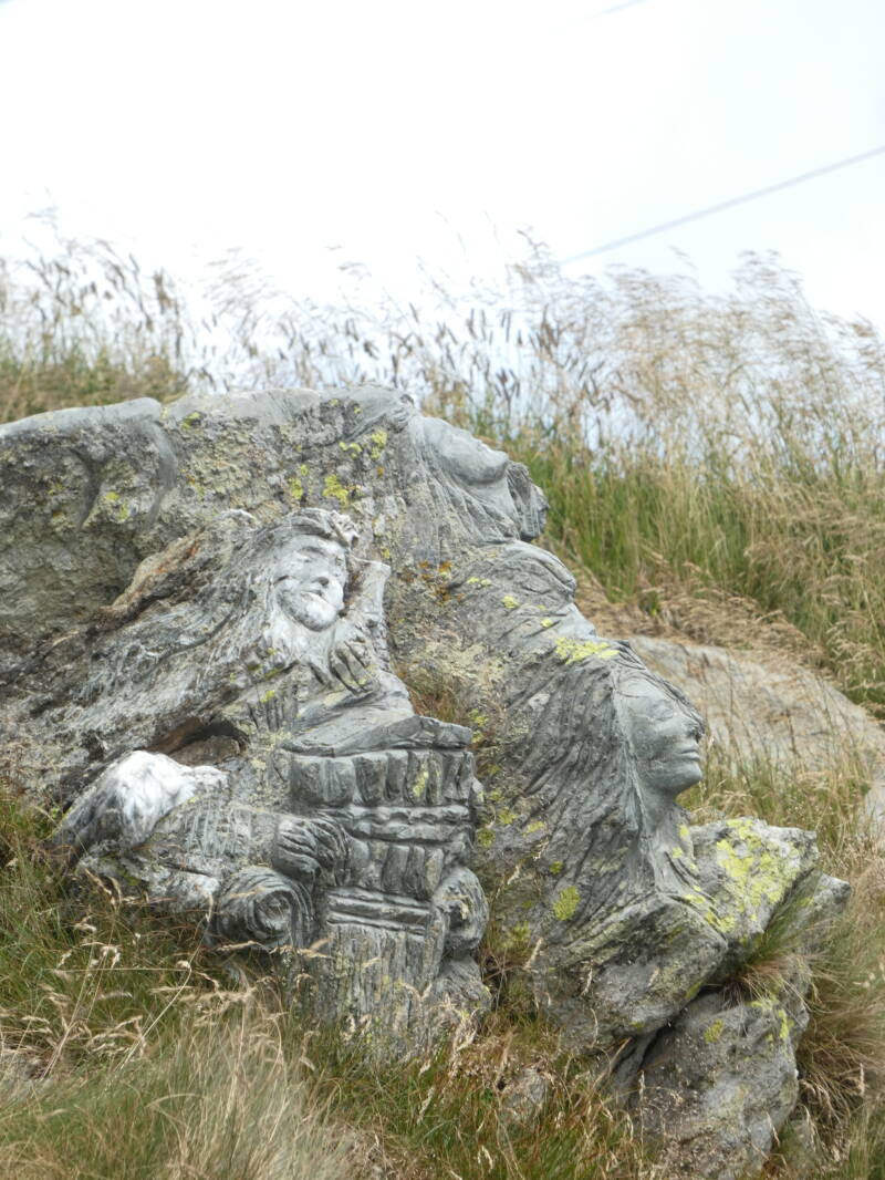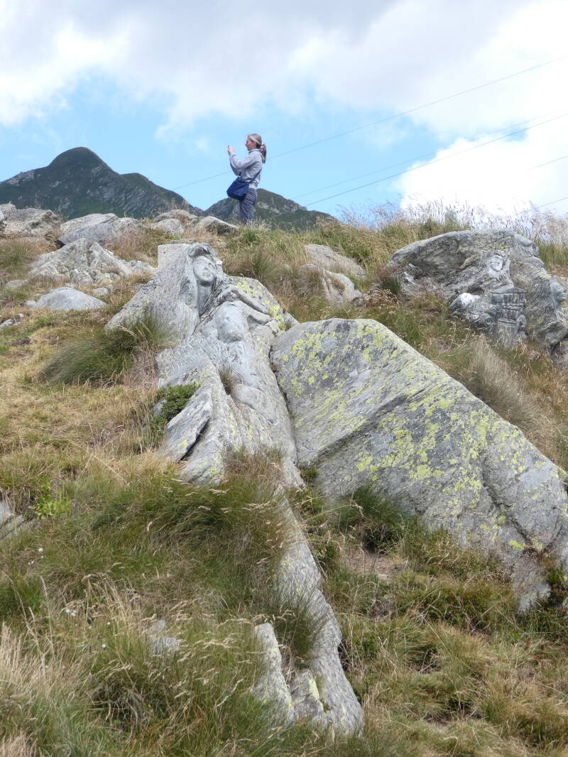 les sculptures rupestres réalisées par Angelo Gabriele Fierro au Passo San Marco, sur la frontière entre la Val Brembana (province de Bergame) et la Valtellina (Sondrio) en Italie