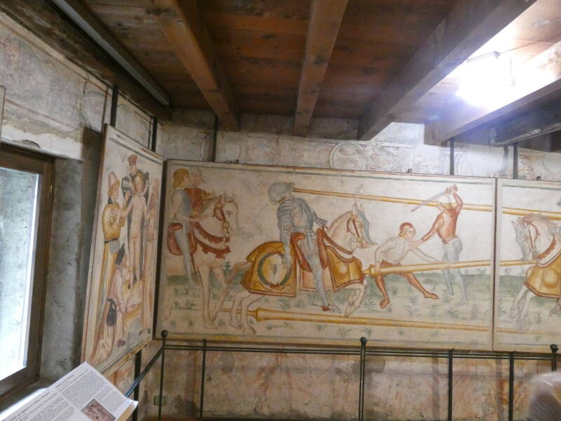 Lors de sa rénovation sur le modèle vénitien, la maison a été enrichie de précieuses fresques, encore visibles aujourd'hui lorsqu'on pénètre dans la grande salle, la Camera Picta. Les fresques, datées de la seconde moitié du XVe siècle, témoignent de l'ascension de la famille Grataroli. Elles représentent un tournoi chevaleresque au cours duquel les membres de la famille, reconnaissables à la "gratarola " (râpe) sur leur bouclier, vainquent leurs ennemis, démontrant ainsi leur puissance aux familles nobles de la vallée, représentées dans les armoiries qui entourent la scène.