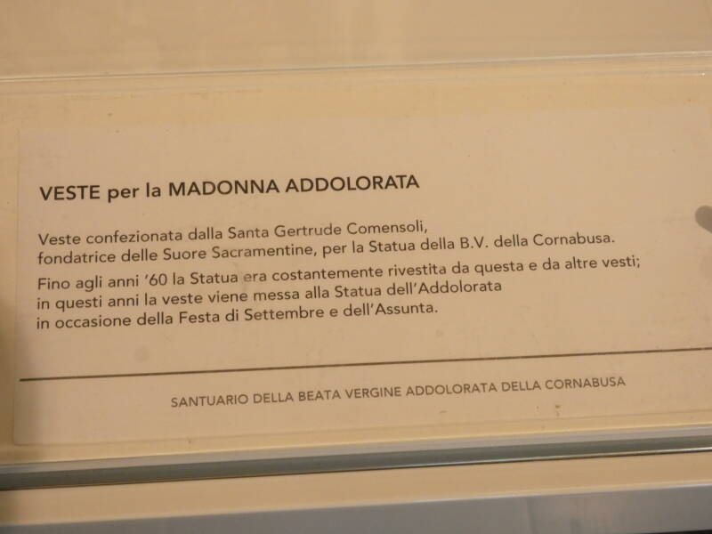 Ce lieu mystique a son origine dans la période des luttes entre Guelfes et Gibelins, entre 1350 et 1440. Pour échapper à la violence, des résidents locaux se cachent dans une « corna busa », qui dans le dialecte local signifie « creux naturel ». L'un d'eux apporte la statue en bois de la Vierge Marie, qu’il oublie dans l'atrium de la grotte quand, échappé au danger, il retourne au pays.