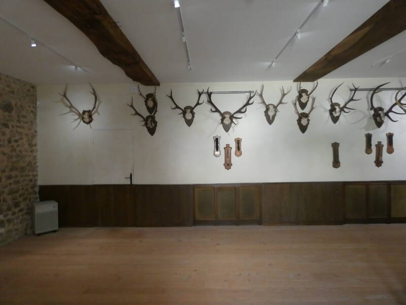 Dans la salle du loup et en écho aux emblèmes des veneurs, des moulages en plâtre de sculptures naturalistes et des animaux naturalisés rappellent que dans cette histoire la place de l'animal est centrale.