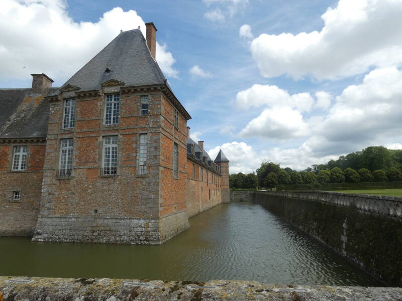 Le château entouré de douves. Sur la gauche, le donjon du XIVe siècle reconnaissable à ses mâchicoulis sous la toiture.