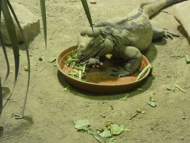 C'est une grande espèce de lézards arboricoles et herbivores du genre Iguana originaire d'Amérique du Sud et centrale. L'adulte mesure environ 1,5 m de la tête à la queue, et certains spécimens peuvent atteindre les 2 m et peser 5 kg, ce qui en fait le plus imposant des iguanes. Il prend diverses couleurs selon sa région d'origine, sa teinte pouvant prendre différents tons de vert, mais aussi être rosée, bleuâtre ou orangée. Il se caractérise également par les anneaux noirs visibles sur sa queue et sa crête d'épines dorsales. L'iguane vert passe le plus clair de son temps dans les arbres, à se nourrir de feuillage. C'est un animal territorial qui se montre agressif envers les autres mâles, notamment en période de reproduction. Les femelles pondent une fois par an, et dès l'éclosion, les jeunes sont livrés à eux-mêmes, souvent victimes de prédateurs comme le basilic. Ils atteignent leur maturité sexuelle à trois ans.