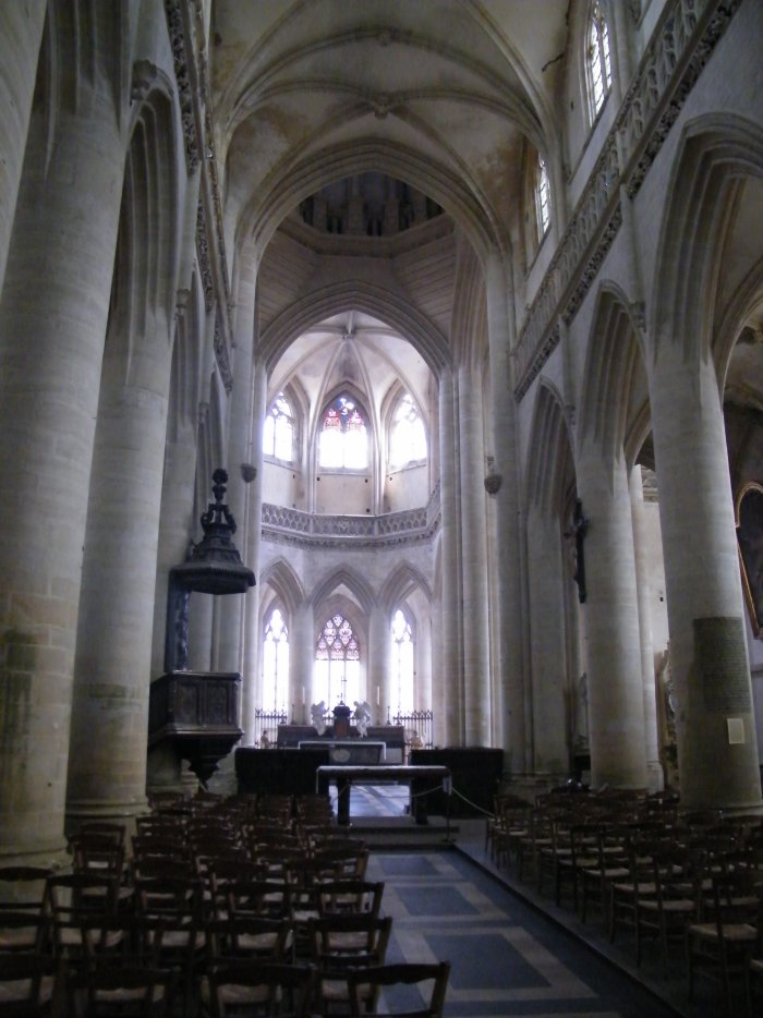 « Ci gisent et reposent les corps de Nicolas Maresq et de Mariette Nicolle sa femme, lequel a fondé à perpétuité en cette église le service des cinq plaies de Notre Seigneur Jésus Christ, avec une grande messe de la résurrection la 4ème semaine d'après la fête de Pâques immédiatement et une grande messe des trépassés fondé par Gilles, François et Thomas Maresq ses fils, en suivant l'intention de leur père le jour de son trépas, qui est le jour de l'octave de Saint Pierre et Saint Paul, patrons de cette église, suivant les contrats passés par devant Corbet et Maudouit, tabellions de cette ville. Priez Dieu pour le repos de leurs âmes. Pater & Ave ». Cette inscription serait du XVIe siècle.