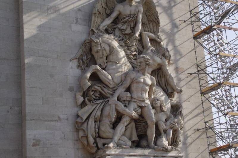 Le Départ des volontaires de 1792 (dit La Marseillaise), par François Rude. Ce haut-relief représente le rassemblement de tous les Français, pour défendre la nation en partant au combat. L'ensemble et la diversité du peuple français est mis en avant par la diversité des soldats partant au combat : révolutionnaires, bonapartistes et royalistes ; jeunes et moins jeunes. Au-dessus d'eux, la Victoire les guide, reconnaissable à ses ailes. Cette victoire fut vite considérée comme une allégorie de la Patrie. L'architecture générale mélange subtilement le style antique (la Victoire casquée et ailée portant l'Égide, les drapés, les cuirasses, les armes, le nu) avec le style appartenant au Romantisme caractéristique du XIXe siècle en France (gestes véhéments, expression marquée des visages, mouvement général)6.