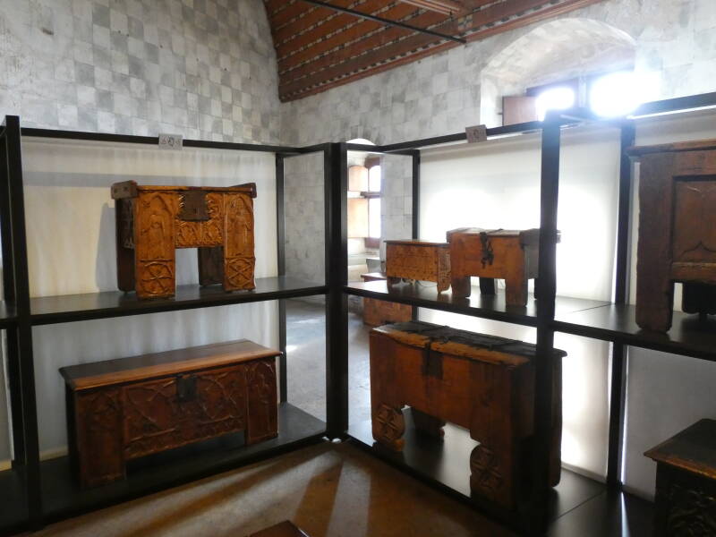 La salle dite aula nova est dévolue à l’exposition des coffres. La collection, dont seule une partie est visible à Chillon, comprend huitante pièces. La plupart d’entre elles datent des XVIIe et XVIIIe siècles, mais certaines remontent à l’époque gothique, voire romane. Les autres salles du château abritent diverses pièces de mobilier telles que tables, chaises, crédences ou encore portes sculptées.